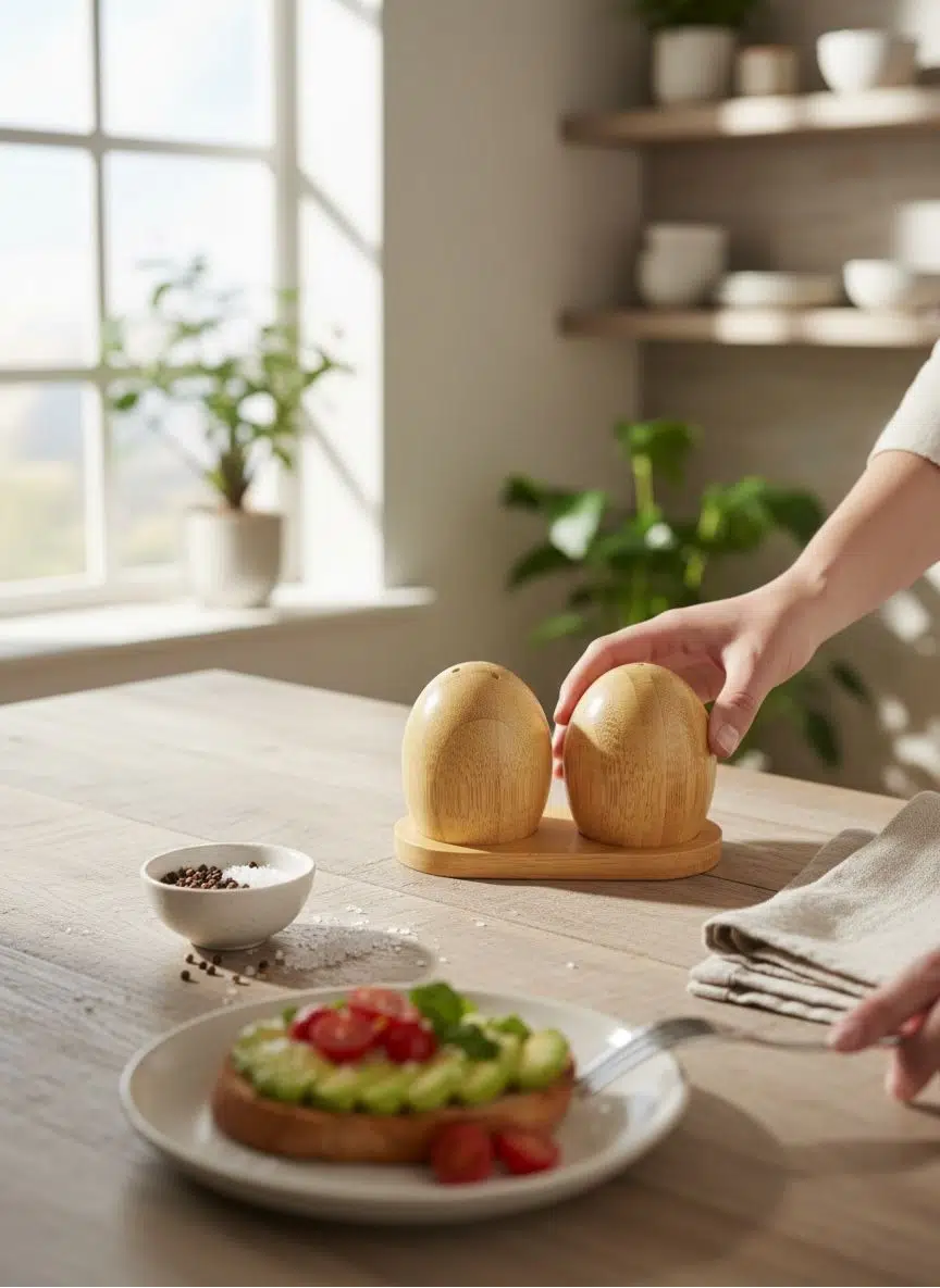 Bambu standlı tuzluk biberlik - 3 parça masa üstü tuzluk biberlik