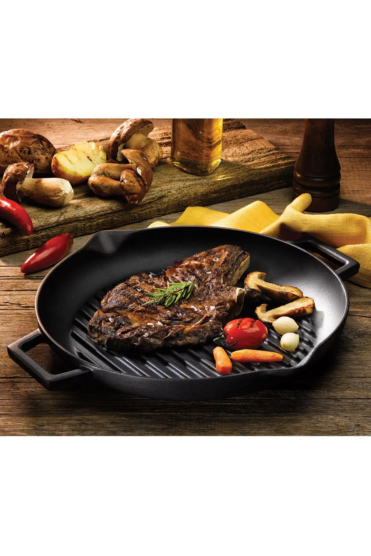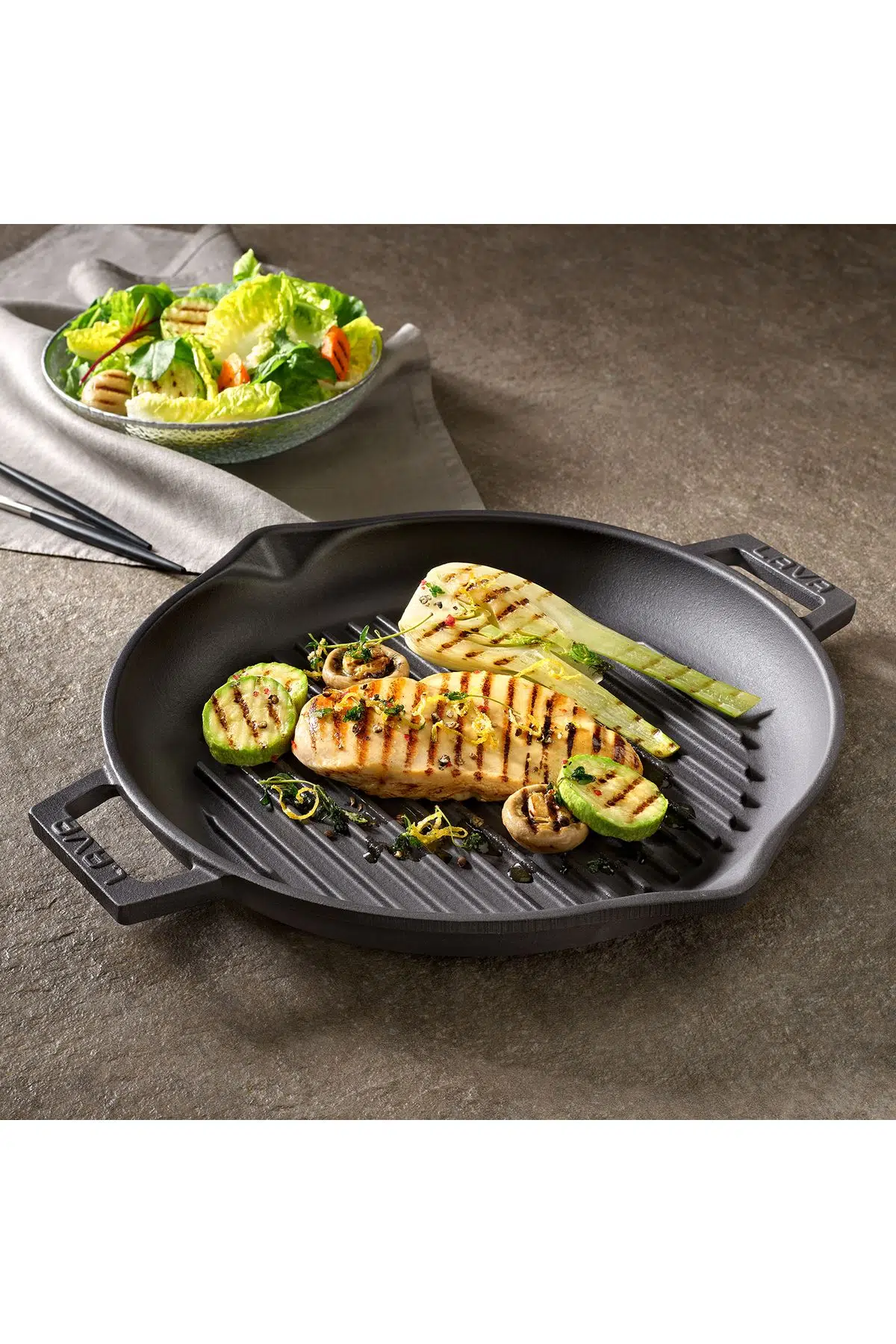 Çift kulpu sayesinde rahat bir tutuş sağlayan LAVA Döküm Yuvarlak Izgara Tava’nız ile ağız sulandıran biftekler, dolgun köfteler ve çeşnili ızgara sebzeler hazırlayabilir