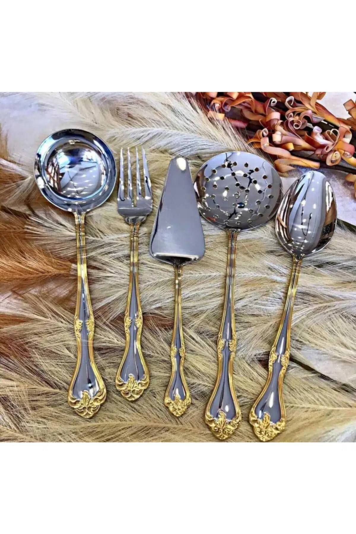 | Etiketler | Nehir lalezar gold servis takımı seti 5 prç.kepçe kaşık kevgir seti |