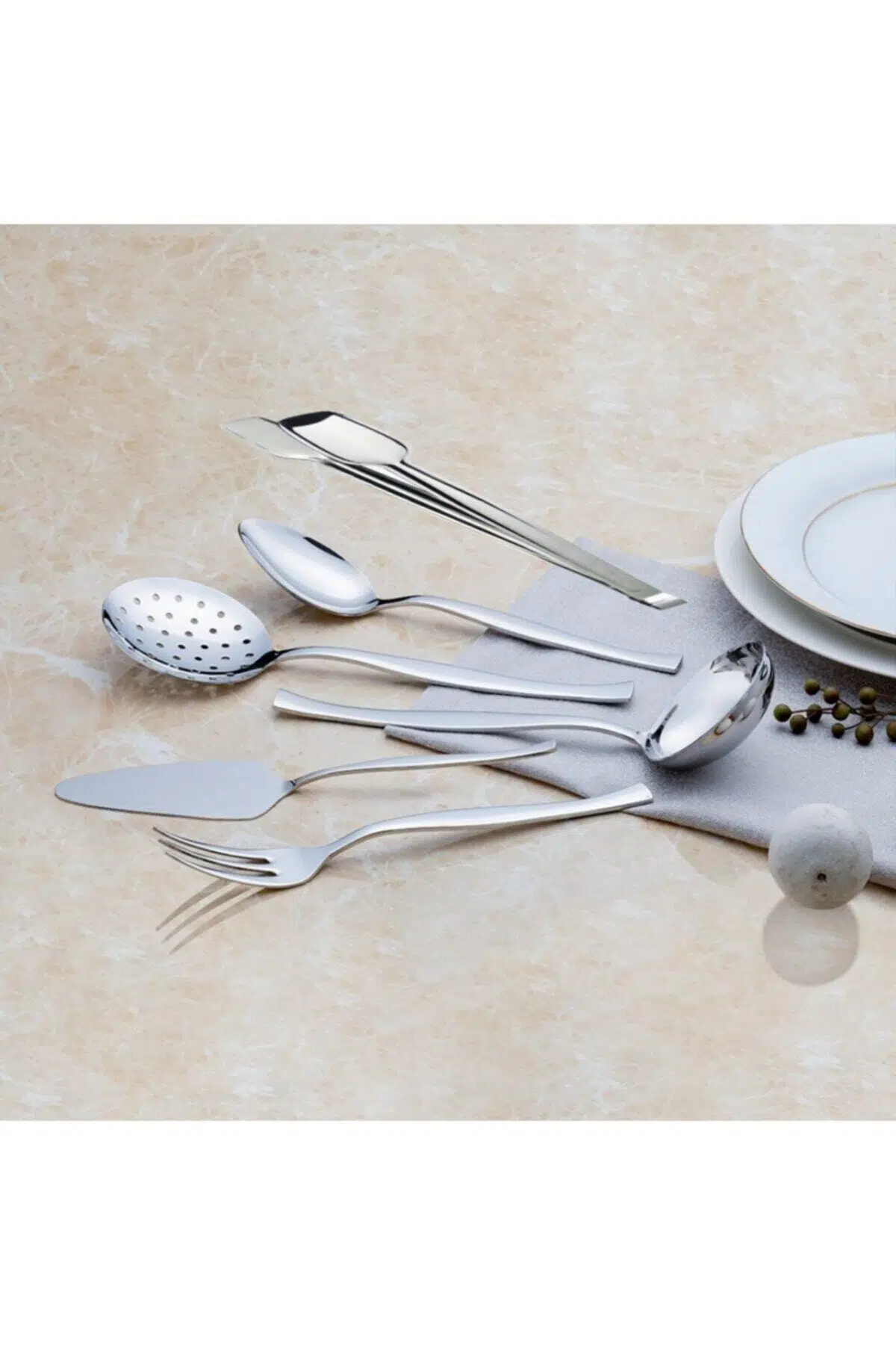 Zarif sade 6 parça servis takımı Tüm nehir çatal kaşık bıçak takımları 18/10 cr-Ni paslanmaz çelik kullanılarak üretiliyor. Tasarımlarında hem güzelliğe, hem dayanıklılığa önem veriliyor. Nehir çatal kaşık bıçak setlerinin tümü 50 yıl paslanmaya karşı garantilidir ve bulaşık makinesinde hassas programda yıkanabilir. Keyifle, yıllarca ilk günkü gibi kullanabilirsiniz Zarif sade 6 parça servis takımı 1 ad. Servis kevgir (29,5 cm) 1 ad. Servis kepçe (26,15 cm) 1 ad. Servis çatal (26,3 cm) 1 ad. Servis kaşık (26,3 cm) 1 ad. Servis kürek (25,6 cm) 1 ad. Izgara maşası (28 cm)